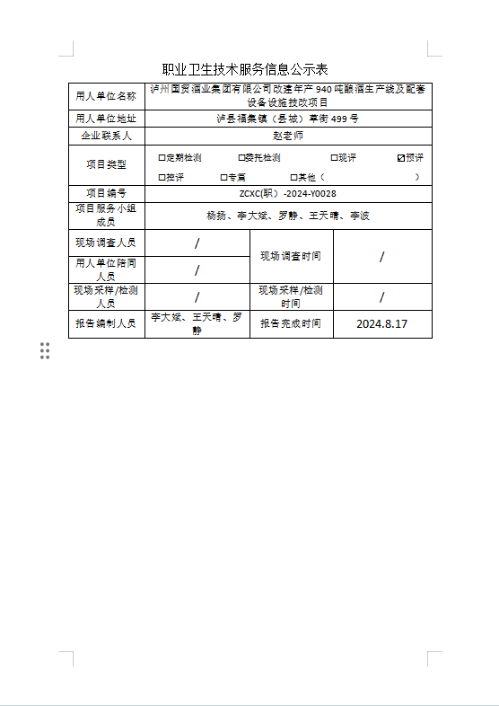 上一篇:泸州国贸酒业集团有限公司改建年产940吨酿酒生产线及配套设备设施技改项目职业病危害预评价