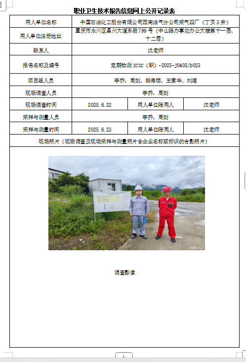 下一篇:中国石油化工股份有限公司西南油气分公司采气四厂(永川南集气站)职业病危害因素定期检测