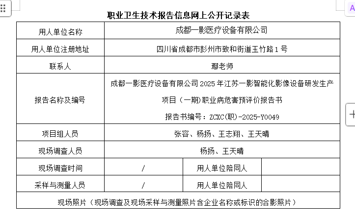 上一篇:成都一影医疗设备有限公司2025年江苏一影智能化影像设备研发生产项目(一期)职业病防护设施设计专篇