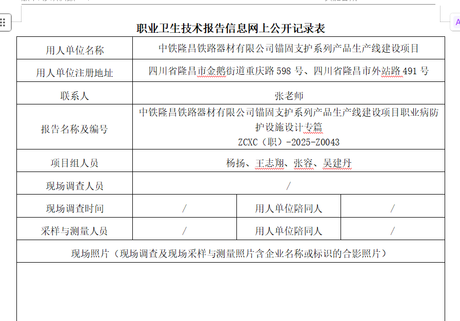上一篇:中铁隆昌铁路器材有限公司锚固支护系列产品生产线建设项目职业病危害预评价
